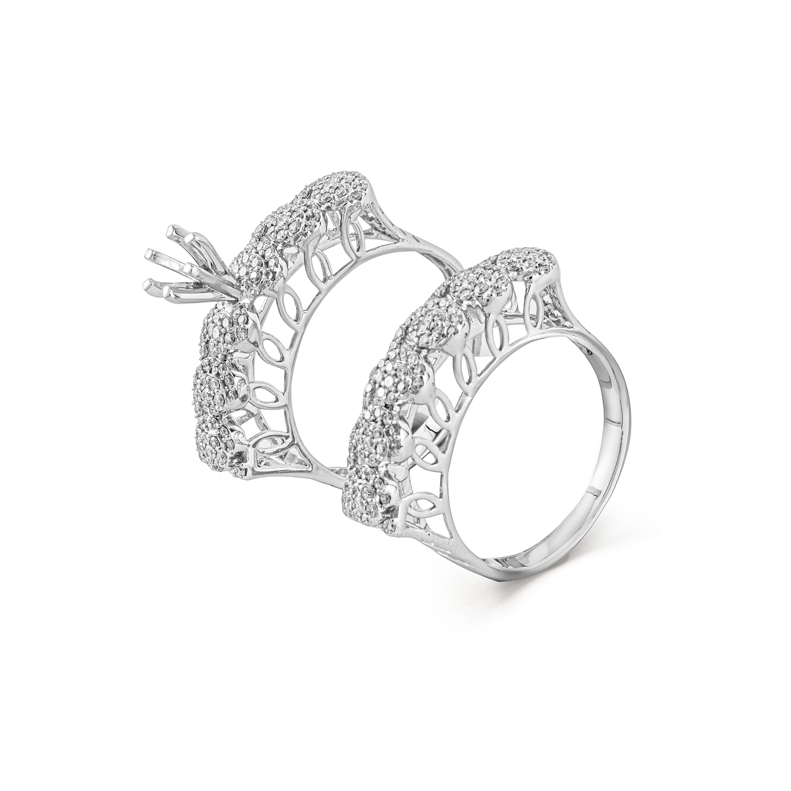 A chic 6 prong basket and gracefully tapered shank lend a vintage feel to this charming engagement ring setting. Graduated round diamonds extend halfway down the shoulders of the 18K white gold setting, playing off the sparkle of your dream center stone.
